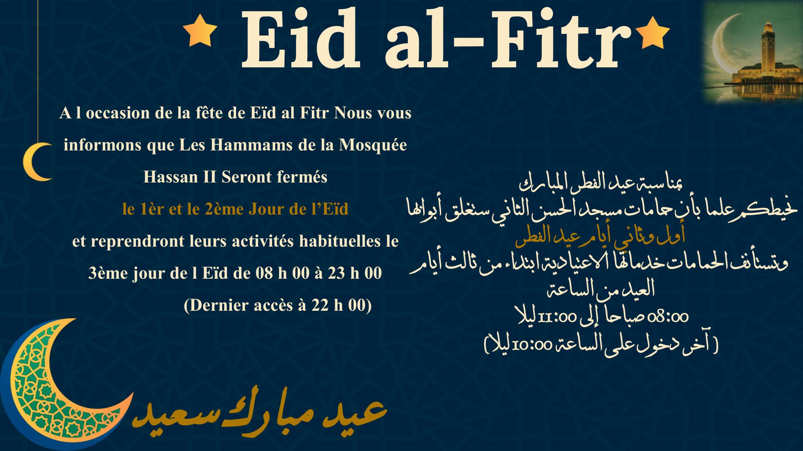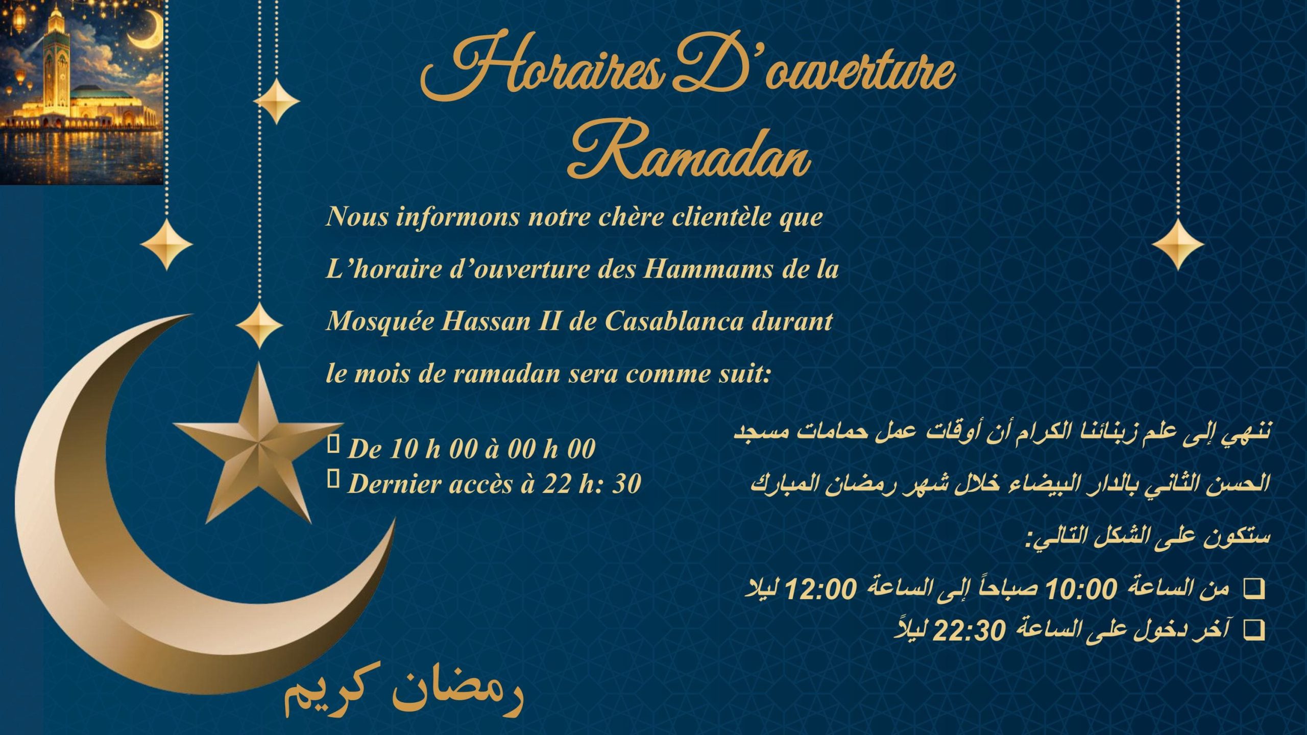 Réalisés dans le respect des normes et standards internationaux et ancrés dans la tradition arabo- musulmane, LES HAMMAMS DE LA MOSQUEE HASSAN II DE CASABLANCA sont constitués de Hammams pour femmes et Hammams pour hommes. Ils occupent une superficie de 3000 m² chacun, ce qui représente 6000 m² en totalité.
