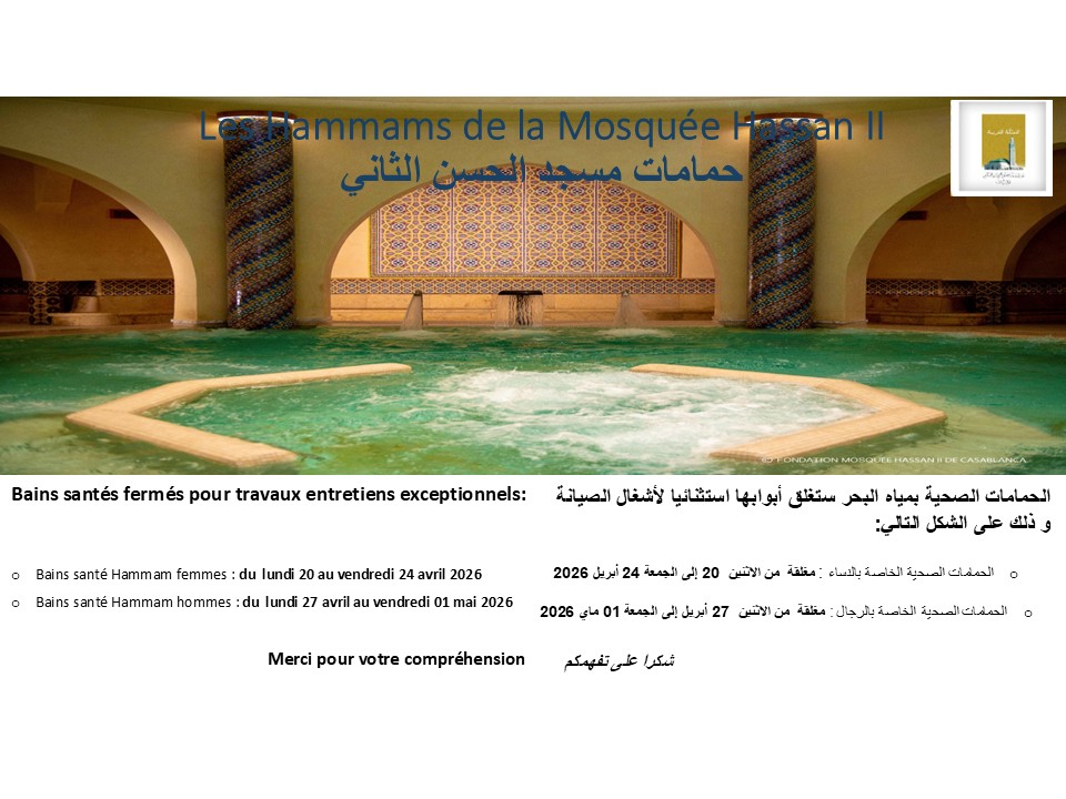 Réalisés dans le respect des normes et standards internationaux et ancrés dans la tradition arabo- musulmane, LES HAMMAMS DE LA MOSQUEE HASSAN II DE CASABLANCA sont constitués de Hammams pour femmes et Hammams pour hommes. Ils occupent une superficie de 3000 m² chacun, ce qui représente 6000 m² en totalité.